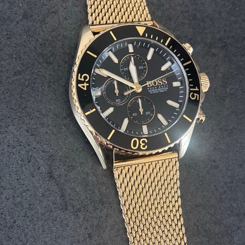 Hugo Boss herreur armbåndsur i tofarvet metal med guld- og sølvfarvet lænke. Uret har rund urkasse og mørk skive med tydelige timemarkeringer og flere mindre subskiver. Designet er egnet til mænd og kan bruges både til hverdag og mere formelle anledninger. Armbåndet er i metal med foldelås.🥰