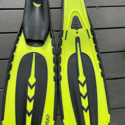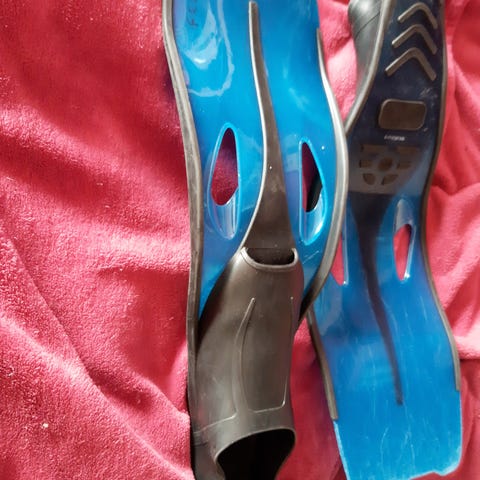 Watery svømmefødder i blå med sort fodlomme. Lukket hæl og fleksibelt blad, velegnet til svømning og snorkling. Fremstillet i kombination af blød gummi ved foden og mere fast materiale i bladet for bedre fremdrift i vandet.