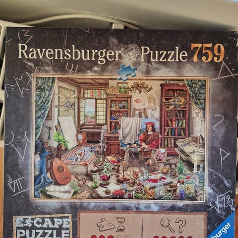 Ravensburger Exit Puzzle puslespil med 919 brikker. Motivet kombinerer puslespil og escape room‑elementer, hvor billedet indeholder forskellige spor og gåder, der skal løses, når puslespillet er lagt. Velegnet til én eller flere spillere, som ønsker en kombination af puslespil og logiske udfordringer.