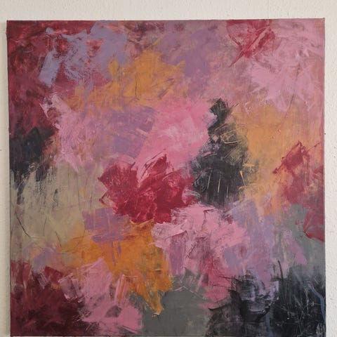 Abstrakt maleri med farverig akryl på lærred. Maleriet har en blanding af røde, grønne, lilla og hvide nuancer, hvilket giver et levende og dynamisk udtryk. Passer til indretning i stuer eller opholdsrum.