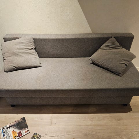 IKEA ASARUM sovesofa i grå betræk. Sovesofaen kan bruges som almindelig sofa i dagligstue, gæsteværelse eller ungdomsværelse og kan omdannes til seng efter behov. Modellen har ryglæn og sidde-/liggeflade i samme grå stof. Velegnet som ekstra soveplads eller kombineret sofa og seng i mindre rum.