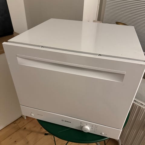 Bosch bordopvaskemaskine i hvid. Kompakt model beregnet til placering på bord eller i skab. Maskinen har frontbetjening med drejeknap og programvælger samt kurv til service og bestikkurv indvendigt. Velegnet til mindre husholdninger, lejligheder eller steder med begrænset plads, hvor der er behov for en mindre opvaskemaskine til daglig brug.