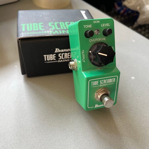 Kontroller for tone, volume og attack på toppen. Tager 9V DC.