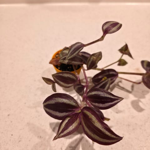 Vandrende jøde med grøn overside og lilla underside. Får små lilla/lyserøde blomster.
