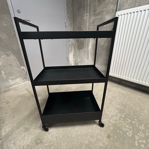 IKEA rullevogn i metal i flere farver. Vognen har åbne sider med lameludskæringer og står på fire hjul, som gør den nem at flytte rundt. Øverste del og topplade er i lyserød, midtersektionen i rød og nederste del i gul. Velegnet som opbevaringsmøbel i fx stue, kontor eller børneværelse til bøger, legetøj eller andre småting.