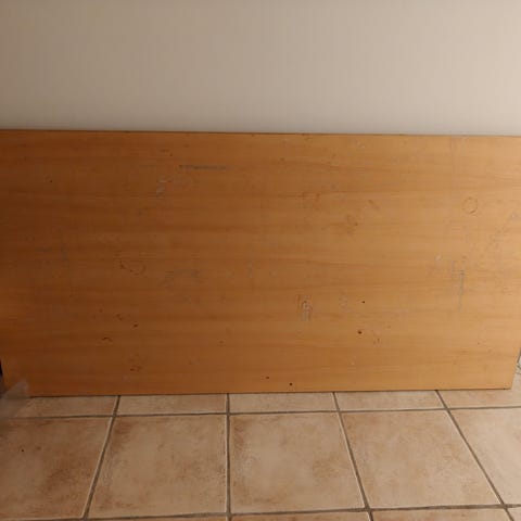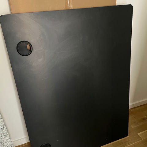2 stk bordplader i spån/egetræsfiner. Har været brugt til skrivebord/arbejdsbord. Pladerne måler B70xL160xH2 cm. Begge sider bærer tydelige brugsspor - specielt undersiderne, hvor stel har været monteret. Prisen er 150 kr for begge plader.