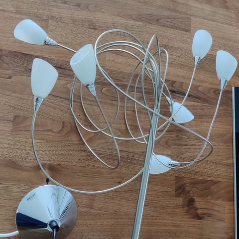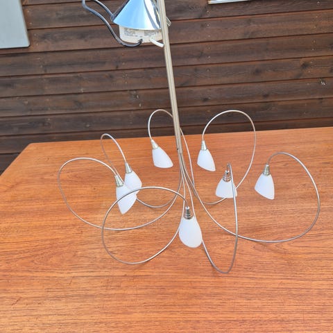Messing loftlampe med 5 arme og hvide glas