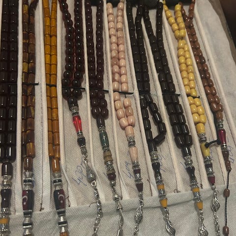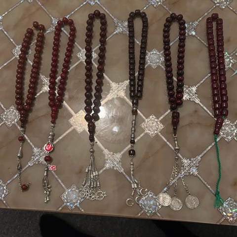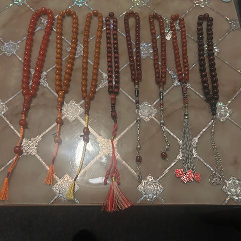Ukendt mærke tasbih perlekæder i forskellige farver og materialer. Kæderne består af runde perler monteret på snor med metal- eller snorafslutninger. Velegnet som bønnekæder eller som dekorative perlekæder. Flere varianter med forskellige perlestørrelser og længder ses på billederne.