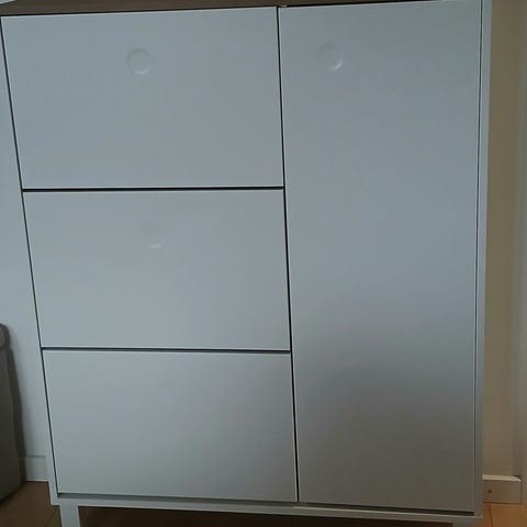 Sælger dette stilfulde og praktiske skoskab med højglans finish. Fire store, nedfældelige rum med plads til flere par sko i hvert rum