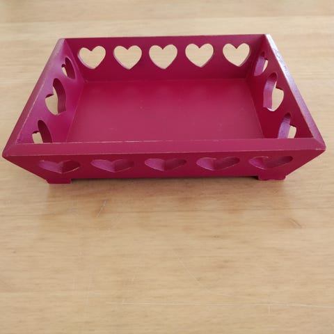 Denne genstand er en dekorativ bakke lavet af træ, måler 39,5x25 cm. Bakken har detaljerede udskæringer langs siderne og har et hjerteformet håndtag på begge kortsider, hvilket giver et klassisk og romantisk udtryk. Træmaterialet har en naturlig grålig farve og giver bakken et rustikt udseende. Den er ideel til at opbevare eller præsentere dekorative genstande i hjemmet.