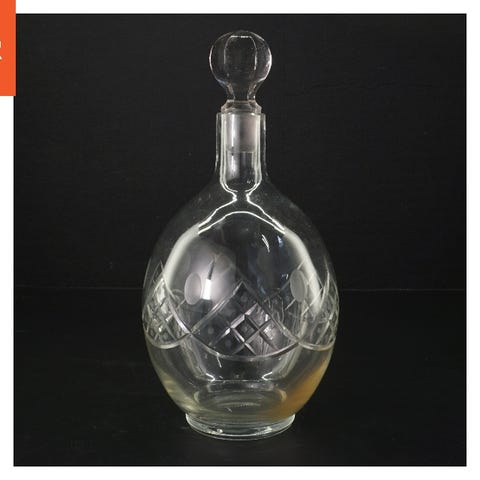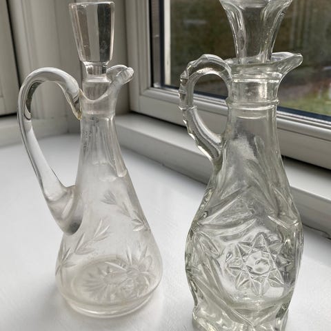 To gennemsigtige glaskarafler med dekoration af drueklaser i relief. Karaflerne har en højde på 20 cm og er designet med en bred åbning for nem påfyldning. Der er ingen synlige mærker eller logoer på karaflerne.