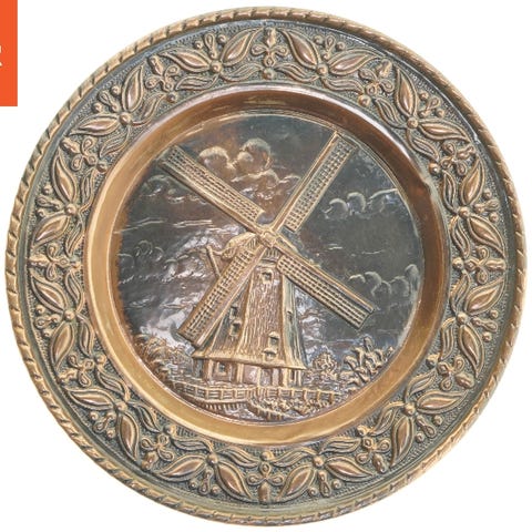 Denne messingvægplade har dimensionerne Ø 12,5x1,5 cm og er dekorativt udformet med et relieffmønster, der forestiller en scene med mennesker og genstande i et rum. Den har en blank, gylden finish, og der er monteret en ophængskrog på bagsiden, så den kan hænges op på en væg. Tags: vægplade, dekoration, messing, relief.