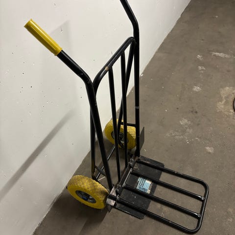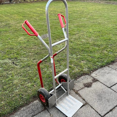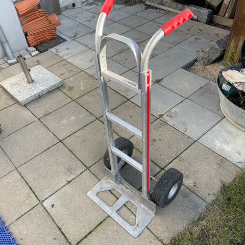 Ravendo sækkevogn i metaludførelse. Modellen har to luftgummihjul med stålfælge og ergonomiske håndtag med plastgreb. Egnet til transport af kasser, flyttekasser og andre tunge genstande på hårde gulve og udendørs underlag. Stabil konstruktion med fast lasteplade og ryglæn, der giver støtte til gods under kørsel. Er kun blevet brugt indendørs til flytning af spilleautomater. Sælges grundet køb af elektrisk trappeløfter. Nypris 1300 kr.