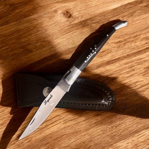 Materiale: Blad: Højt kulstofstål / Håndtag: Solid messing / Etui: Ægte læder