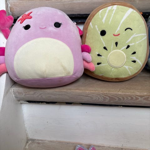 Squishmallows plysdyr med clip i rød farve. Figuren er blød og rund med små arme/ben og et enkelt ansigt. Øverst er der en plastclip, så den kan sættes fast på fx taske, nøglebundt eller rygsæk. Velegnet som lille krammedyr eller nøglering til børn.