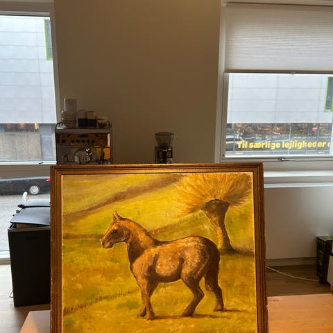 Theodor Philipsen oliemaleri med motiv af græssende heste på mark. Maleriet er udført på lærred og monteret i en profileret guldfarvet ramme. Der er mærkat fra Bruun Rasmussen på bagsiden med oplysninger om kunstner og tidligere vurdering. Velegnet som vægudsmykning i stue, kontor eller lignende rum, hvor man ønsker et klassisk hestemotiv i traditionel ramme.