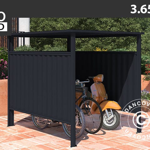 Fritstående cykelskur i metal med buet tag i grå farve. Skuret er velegnet til opbevaring og beskyttelse af cykler mod vejr og vind. Konstruktionen består af fire stolper og et fast tag, som giver overdækning til fem cykler ad gangen. Egnet til placering i indkørsel, gårdhave eller fælles cykelområde.