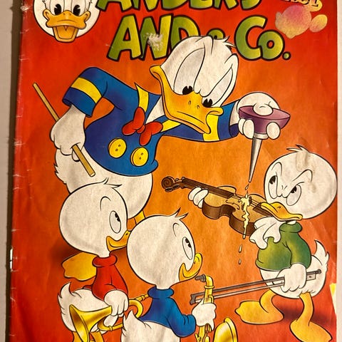 Anders And Sommer-sjov tegneserieblad med Disney-figurer på forsiden, herunder Anders And, Rip, Rap og Rup samt Mickey og Minnie Mouse. Bladet er velegnet til læsning for børn og andre, der kan lide klassiske Disney-tegneserier og sommerrelaterede historier.