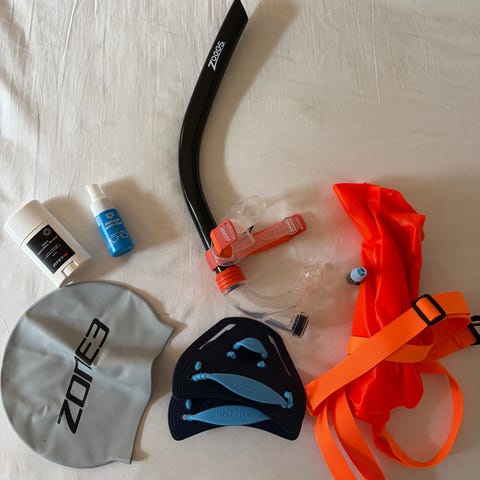 The buoy attaches via an adjustable waist belt and floats behind you without affecting your stroke. Also includes a small dry storage compartment for keys, phone, or small essentials.