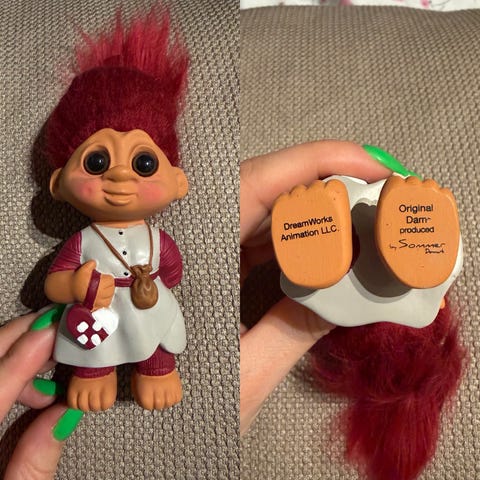 Dam Things DreamWorks troll figur udformet som skoleelev. Figuren har strithår og bærer stribet skjorte, briller, taske og bog samt et lille æble i hånden. På undersiden er den mærket med "Original Dam troll" og "DreamWorks Trolls DWA LLC". Velegnet som samlerobjekt eller pynt.