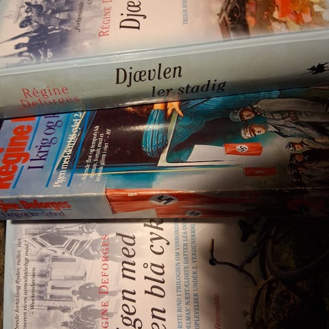 Régine Deforges "Pigen med den blå cykel" bog. Dansk udgave af den historiske roman, der foregår under Anden Verdenskrig 1939-42. Paperback med illustreret forside og bagside. Velegnet til læsere af historiske og romantiske romaner med krigstidsbaggrund.
