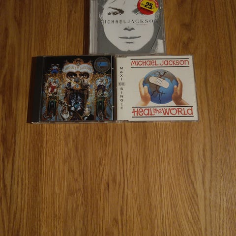 Michael Jackson samling bestående af flere cd’er, dvd’er og bøger. På billedet ses forskellige albumudgivelser, bokssæt og trykte udgivelser om kunstnerens liv og karriere. Samlingen kan bruges til lytning, visning og som reference for interesserede i Michael Jacksons musik og historie. Antallet af enheder og specifikke titler fremgår af billedet. Sælges samlet for 50 kr.