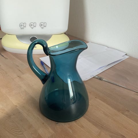 Blå glas kande med dekorativ metalhank og metalbånd omkring halsen. Kanden har en rund, pæreformet krop og en profileret tud i metal. Egnet som pyntegenstand eller til let servering. Materialer består af farvet glas og metaldetaljer i et ornamenteret design.