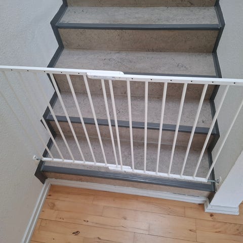 Baby låge. Gitterlåge. Til at sidde i en døråbning. Kan stilles mellem 60 cm og 85 i bredden. Vi har brugt den et lille i år - nu skal den videre. :-)