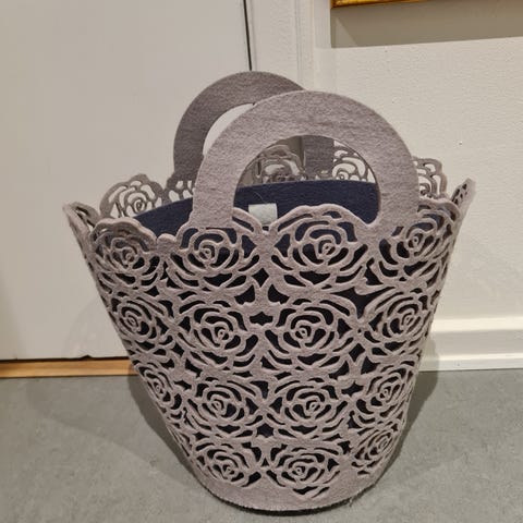 Fin og velholdt rund strikke kurv med hank.