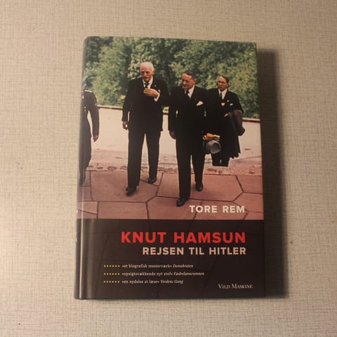 Tore Rem Knut Hamsun Rejsen til Hitler bog. Hardback-udgave med omslag, der omhandler Knut Hamsuns rejse og relation til Hitler og nazismen. Bogen er på dansk og udgivet af forlaget Vild Maskine.