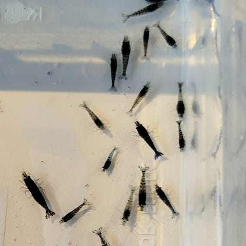 Smukke blå rejer til akvarie sælges for 10 kr pr stk.