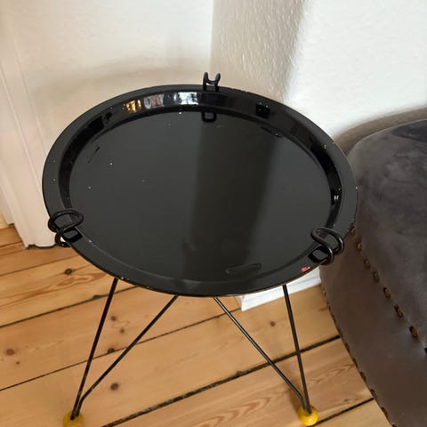 Bordet er på hjul med stålben, begge bakker kan vendes og er sorte på den ene side og hvide på den anden. Det er i rigtig fin stand uden hakker og ridser.