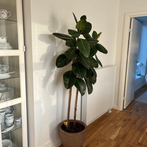 Gummifigen stueplante med ovale, mørkegrønne blade. Planten står i en rund plastpotte med underskkål. 130 h
