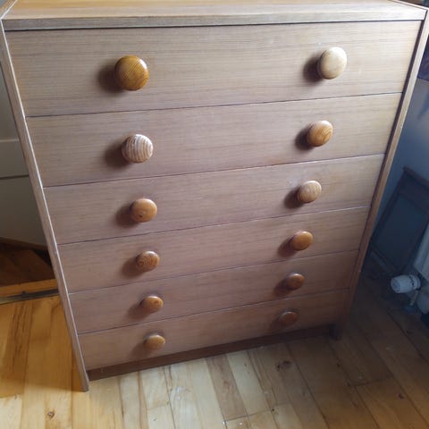 Gammelt brugt kommode i fyrretræ, der er malet rød, fra 1950’erne. Afrundethjørner. Tre skuffer. Den trænger til at blive malet, har fået nogle knus. Se billeder. Bredde 100cm, dybde 40 cm, og højde 64 cm.