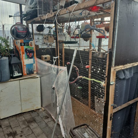 Voliere fuglebur i metal Buret består af metalramme med trådnet og faste vægge på dele af siderne. Indvendigt er der monteret træredekasser og siddepinde. Egnet til indendørs hold af mindre fugle eller som voliere i udhus/lade. Buret giver mulighed for montering af ekstra pinde, skåle og tilbehør efter behov.