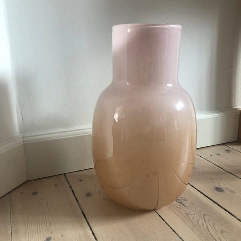 Spændende mundblæst glasvase i blå og grønlige nuancer, ca. 17cm bred og 14 cm høj
