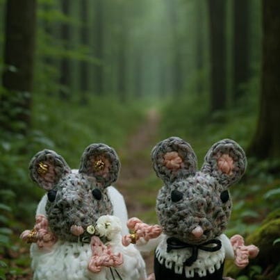 Små søde hæklede mus med kjole og matchende øreringe. Helt almindelige øreringe som nemt kan tages ud og egne kan sættes i .