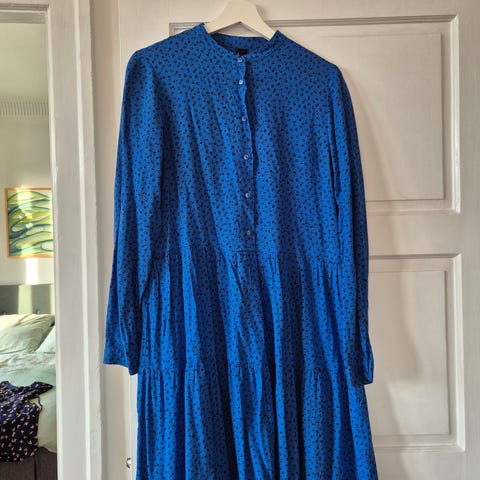 Vero Moda hverdagskjole til kvinder i størrelse XL. Kjolen er fremstillet i polyester og har et blåt, mønstret design med lyse detaljer. Modellen har lange ærmer med manchet og knaplukning ved ærmekanten. Velegnet som hverdagskjole og kan bruges med strømpebukser eller leggings afhængigt af sæson.