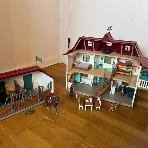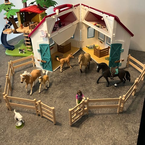 Schleich legetøj hestegård og træhus med heste og figurer. Sættet består af en transportabel hestestald med rødt tag, grønne stalddøre og indrettet indvendigt med foder og halmballer samt en træhytte med rutsjebane, gynge og stige. Der medfølger flere heste, føl, hund og andre smådyr samt menneskefigurer. Egnet til leg med bondegård og hestetema og kompatibelt med andre Schleich dyr og figurer i samme skala.