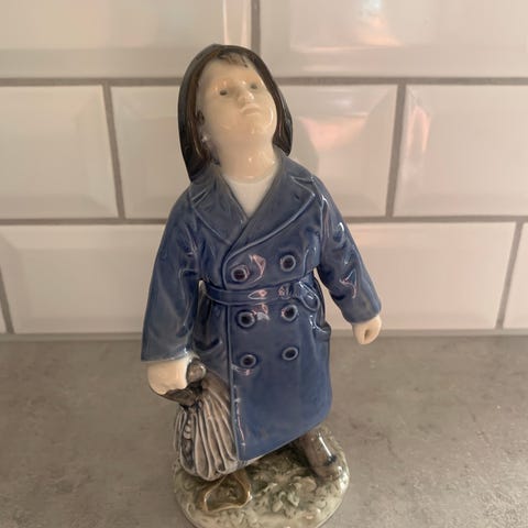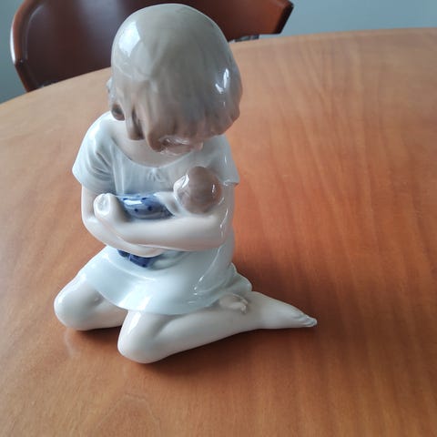 Figur i porcelæn, der forestiller to piger stående sammen, hvor den ene holder en dukke. Figuren er glaseret i lyse nuancer med detaljer i blå og mørke toner.