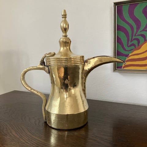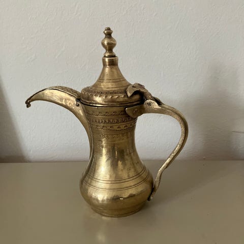 Messingkande med låg. Kanden er udført i messing med buet hank, lang tud og låg med knop. Velegnet som dekoration. Klassisk form med synlige brugsspor, der giver et patineret udtryk .Købt på marked i Saudiarabien i begyndelsen af 1980-erne