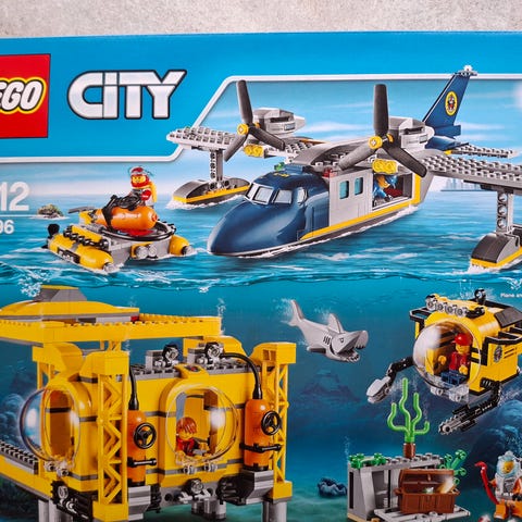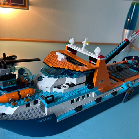 LEGO City 60095 dybhavs-undersøgelsesskib byggesæt. Sættet indeholder et stort forskningsskib med kran, mindre ubåde og dykkerudstyr samt et vrag af et skib til undervandsudforskning.