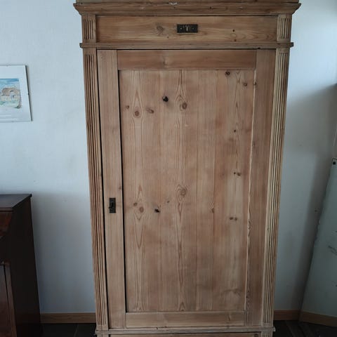 Rumligt karlekammerskab i massiv træ, som kan blive fint, hvis det friskes op eventuelt med en anden farve.