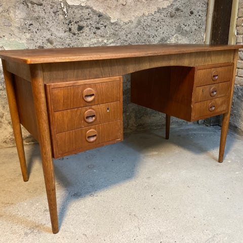 Skrivebord eller spisebord til to i teak. Oval form med S-formede ben. Smukke former og kan komme til at se spritnyt ud med en overfladebehandling af olie og evt. slibning.