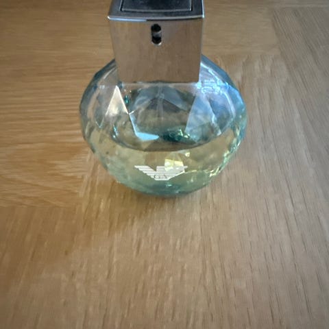 Parfume flakon i klart glas med dekorativ gennemsigtig glasprop. Flasken indeholder en gylden parfumevæske. Velegnet til opbevaring af parfume eller som dekorativ flaske på badeværelse eller kommode.