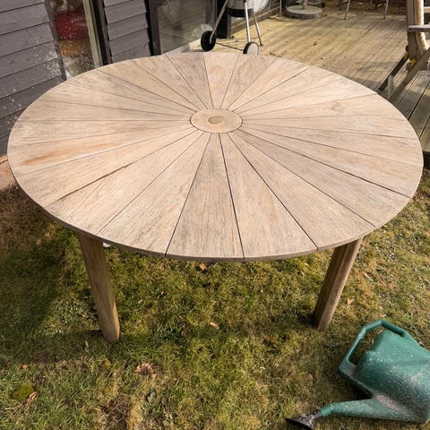 KAN handles I DAG for kun 2900,- Robust Ø 150 cm smukt solbord i massiv Kerneteaktræ. Meget stabilt og plads til 6-8 personer og evt parasol i midten. Bordbenene er også massiv kraftig kerneteak. Bordet er vedligeholdelsesfrit pga den kraftige kerneteak og kan stå ude hele året. Du kan evt slibe let og give det olie, hvis du ønsker det mørkere.