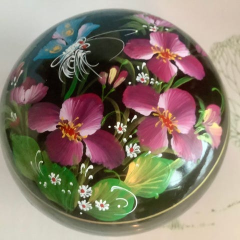 Smukt håndmalet lakskrin med håndskåret blomster indeni.