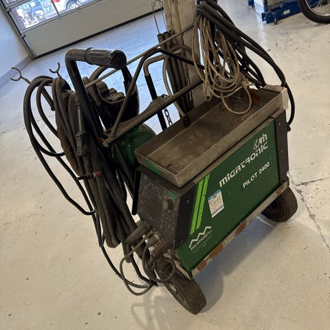 Diamig svejseapparat med tilhørende gasflaske og manometer. Enheden omfatter svejsekabler og regulator med dobbelt manometer til justering og aflæsning af gastryk. Egnet til svejseopgaver, hvor der anvendes beskyttelsesgas. Yderligere tekniske specifikationer som effekt, spænding og svejsekapacitet fremgår ikke af billederne og bør kontrolleres på typeskilt eller manual.