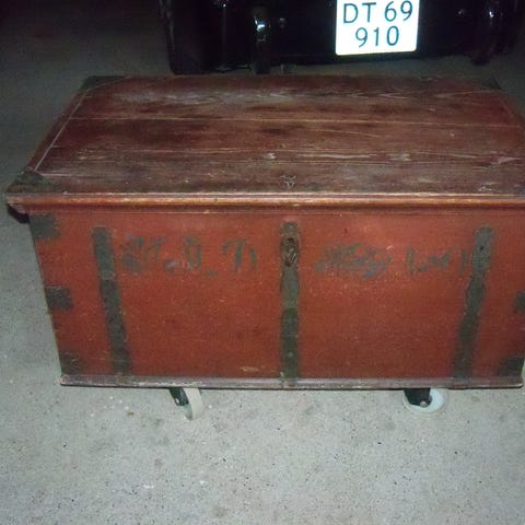 Skattekiste med hængslet låg og malet blomstermotiv på toppen. Indvendigt er kisten malet i en rødlig farve.