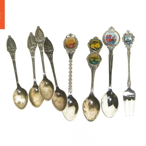 Dekorative souvenirskeer med klassiske håndtag og bymotiver.
